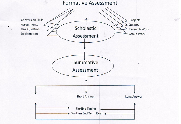 - The school based evaluation of students will cover all aspects of a student’s development…….that includes “scholastic” and “co-scholastic” assessment. Some of the components of “scholastic” assessment will include …….assignments/class tests, research work, oral questions, class work/home work, project work, experiments etc. while the “co-scholastic” assessment will include-testing of social skills, emotional skills, thinking skills, co-curricular activities, clubs, attitudes, values etc.